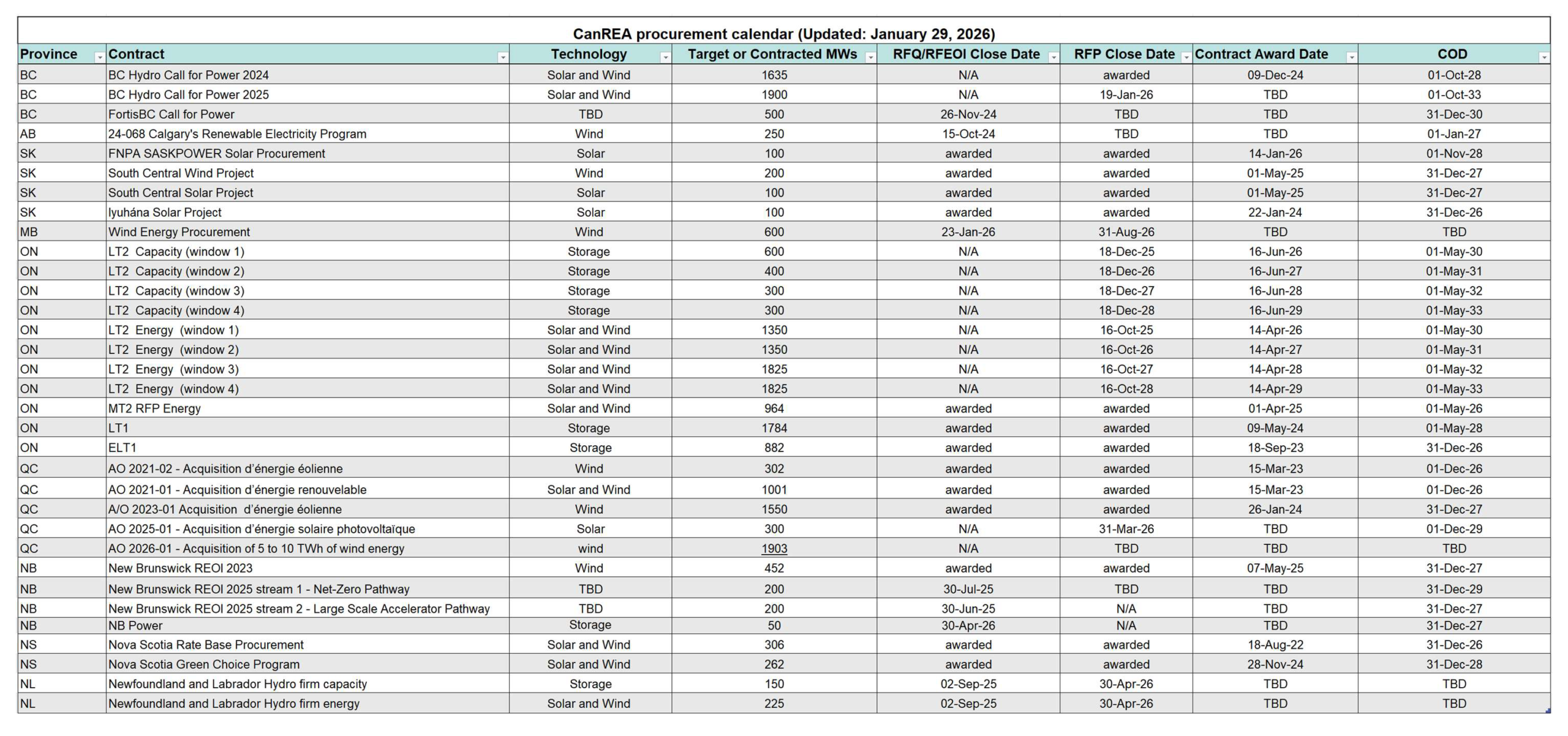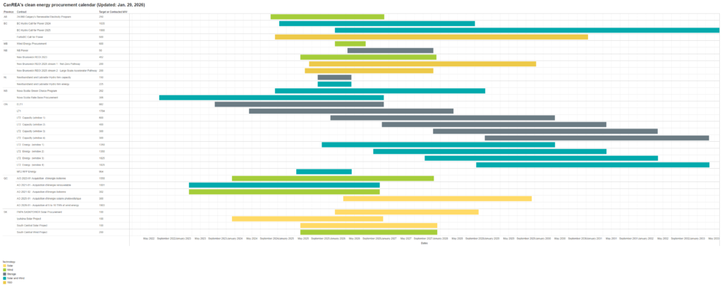 To support this shift, CanREA has developed a Clean Energy Procurement Calendar—a tool designed to track and consolidate procurement opportunities in wind, solar and energy storage across Canada.